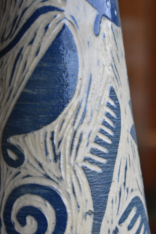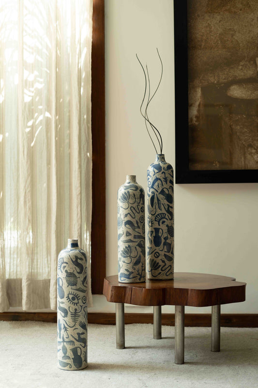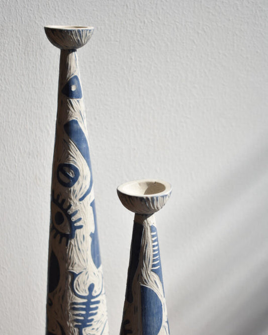 Crafted in stoneware clay, adorned in a striking blue oxide tint, and finished with a clear glaze, Phoenix celebrates grandeur in detail and craftsmanship. Perfect for contemporary architectural & interior project in the transcontinental country of Egypt; or as a distinctive addition to modern eclectic restaurants, bars or licing spaces.