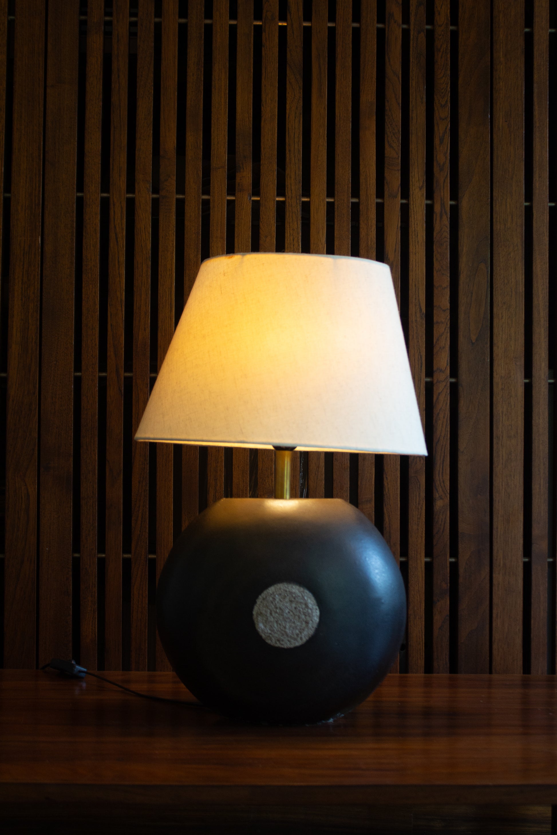 Elevate your interiors with the sophisticated Black Sand Lamp. Its rounded ceramic base features a striking black glaze, accented with a band of textured sand detailing around the middle, creating a beautiful contrast of smooth and raw elements. The minimalist yet bold design, paired with a neutral fabric lampshade, makes this piece perfect for adding a touch of modern elegance to any room. Ideal for contemporary and eclectic spaces.