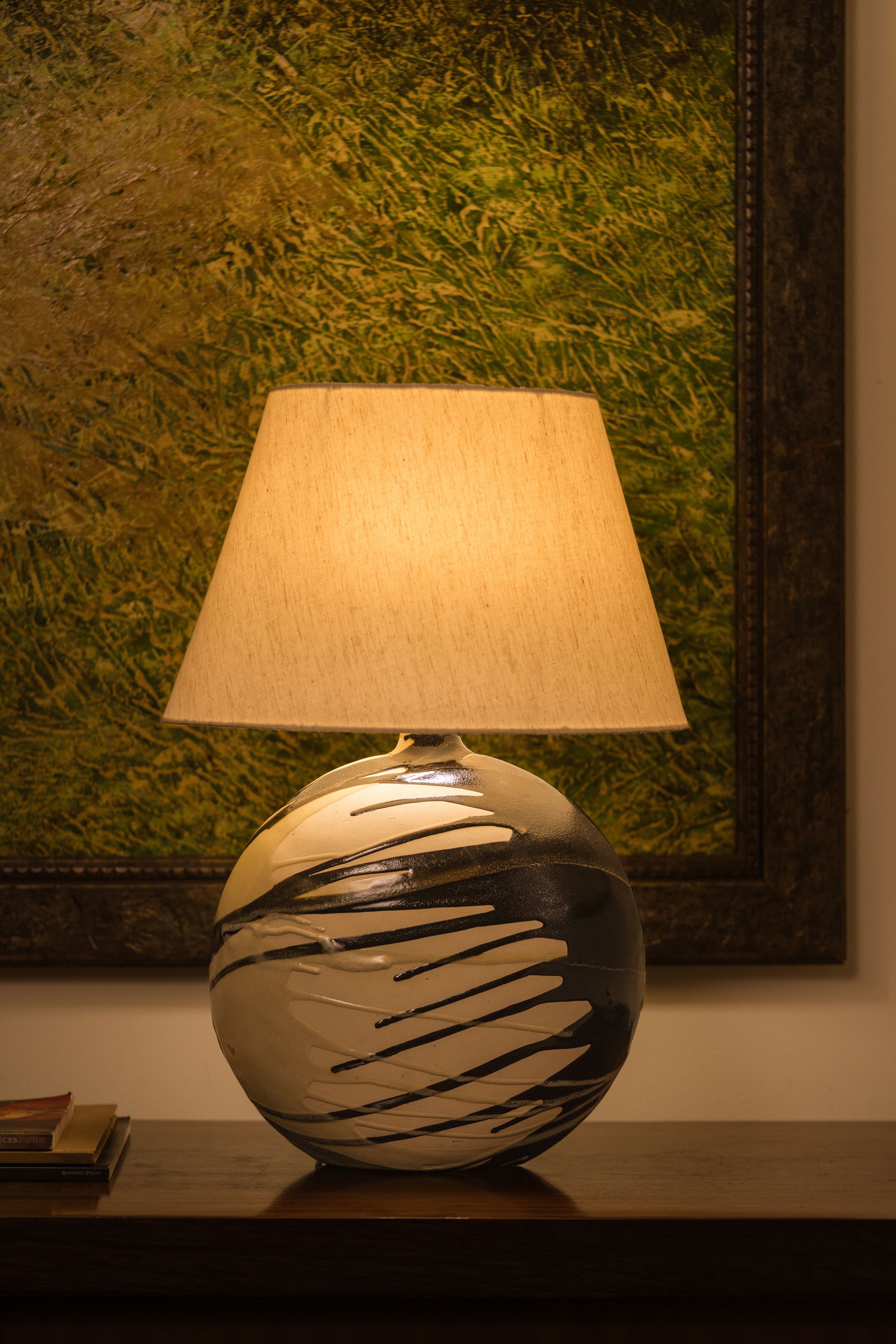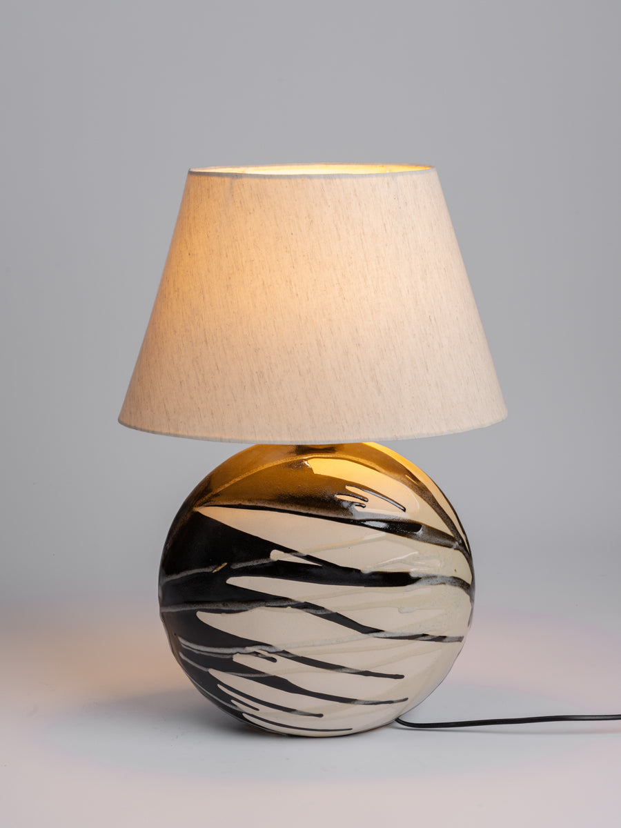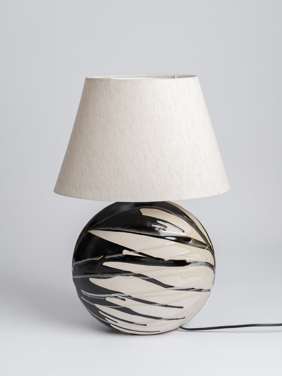 Inspired by the celestial beauty of an eclipse, the Eclipse Moon Lamp brings a cosmic touch to your decor. Its smooth, rounded ceramic base is glazed in a moon-like finish, evoking the mystery of lunar phases. With its minimalist design and soft glow, this lamp creates a calming ambiance, perfect for a bedroom or serene living space. The natural tones of the base paired with a neutral fabric lampshade make it a versatile piece for any style.