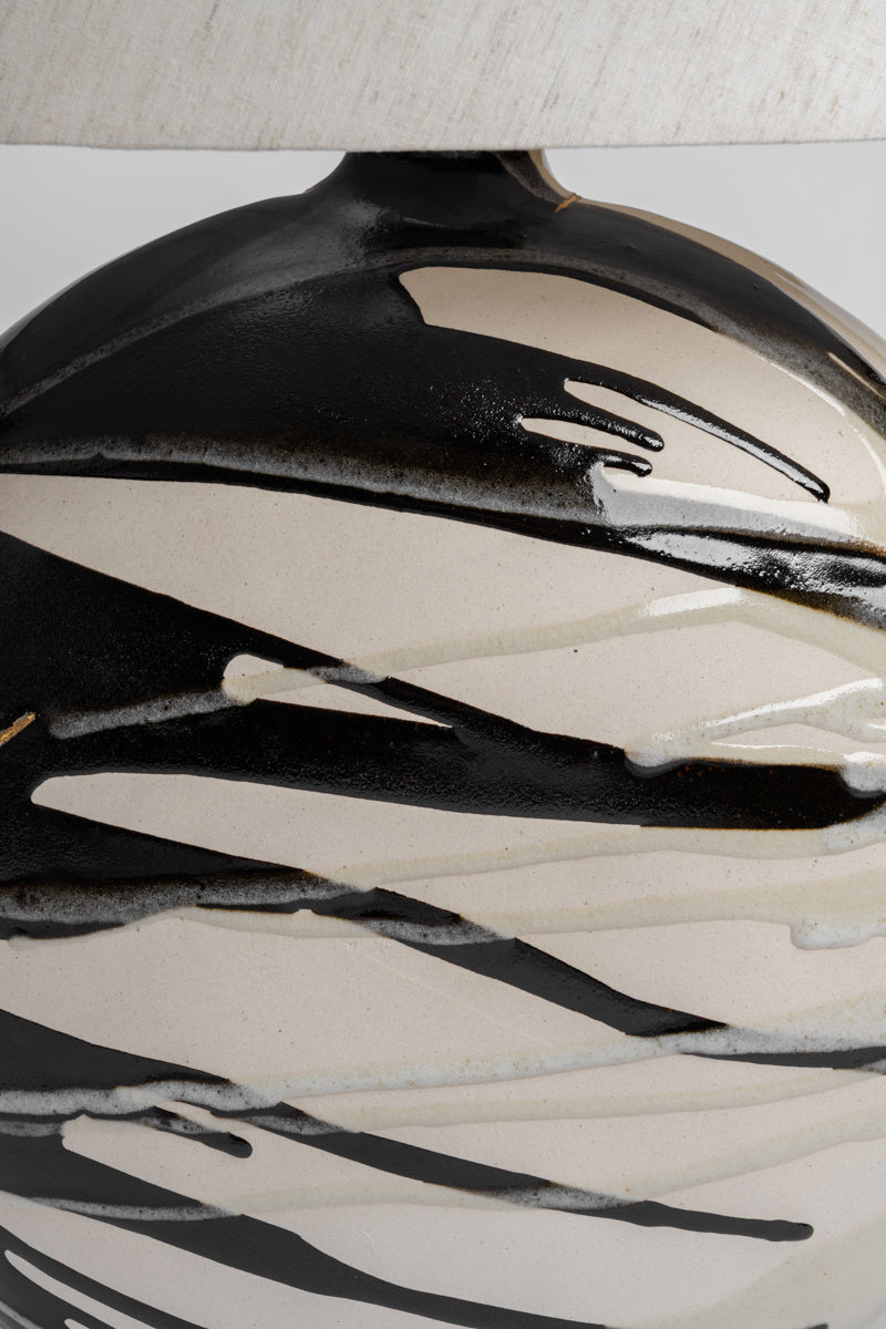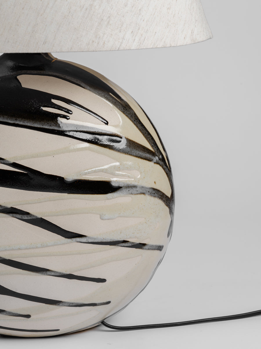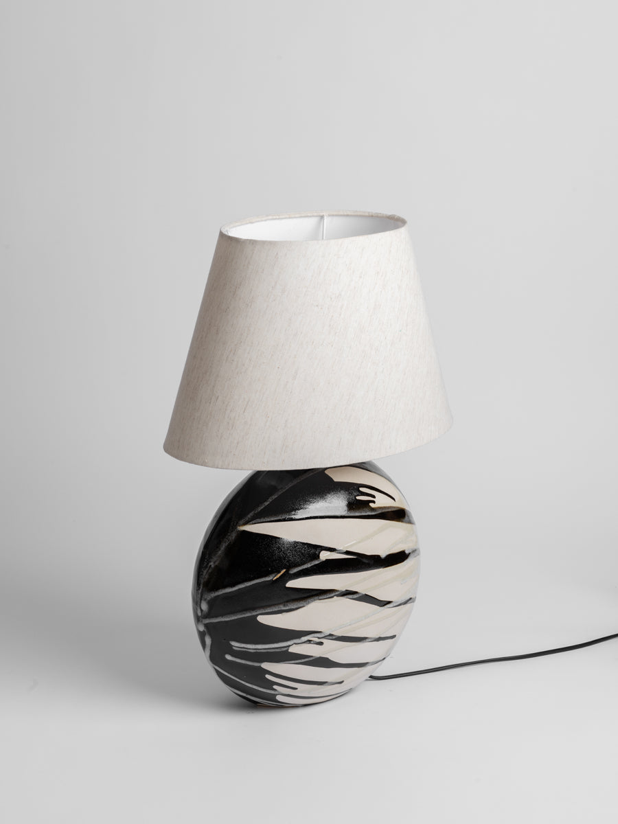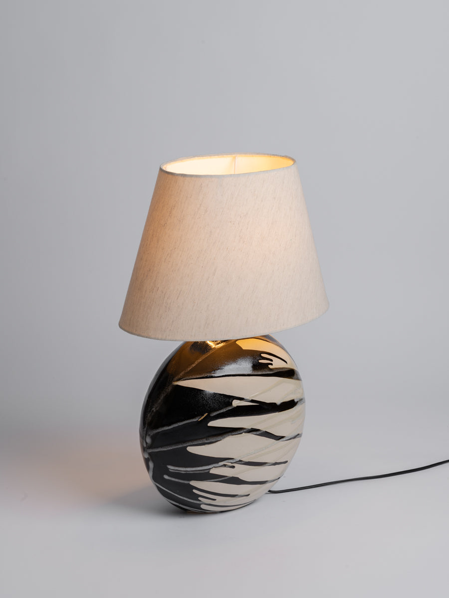 Inspired by the celestial beauty of an eclipse, the Eclipse Moon Lamp brings a cosmic touch to your decor. Its smooth, rounded ceramic base is glazed in a moon-like finish, evoking the mystery of lunar phases. With its minimalist design and soft glow, this lamp creates a calming ambiance, perfect for a bedroom or serene living space. The natural tones of the base paired with a neutral fabric lampshade make it a versatile piece for any style.