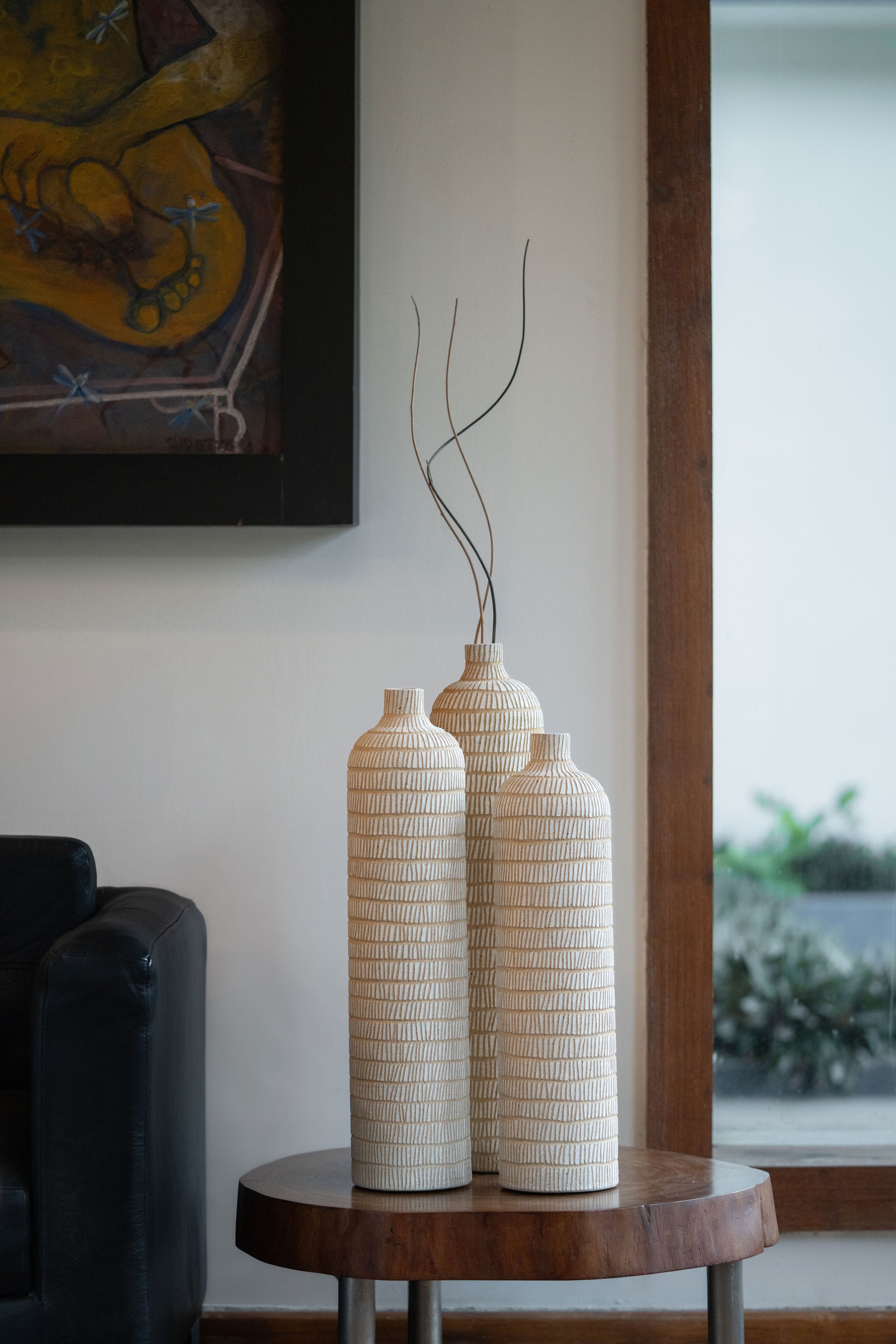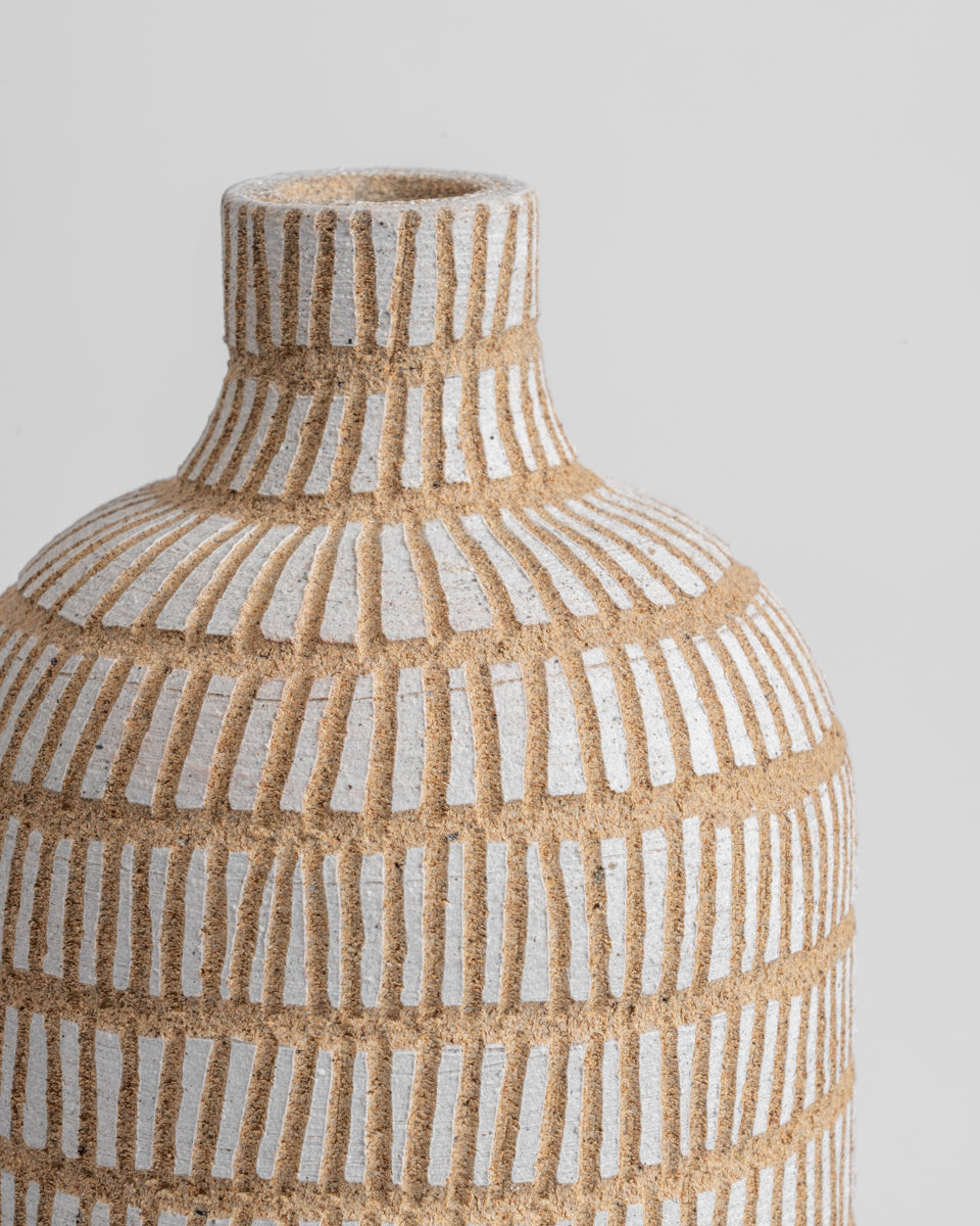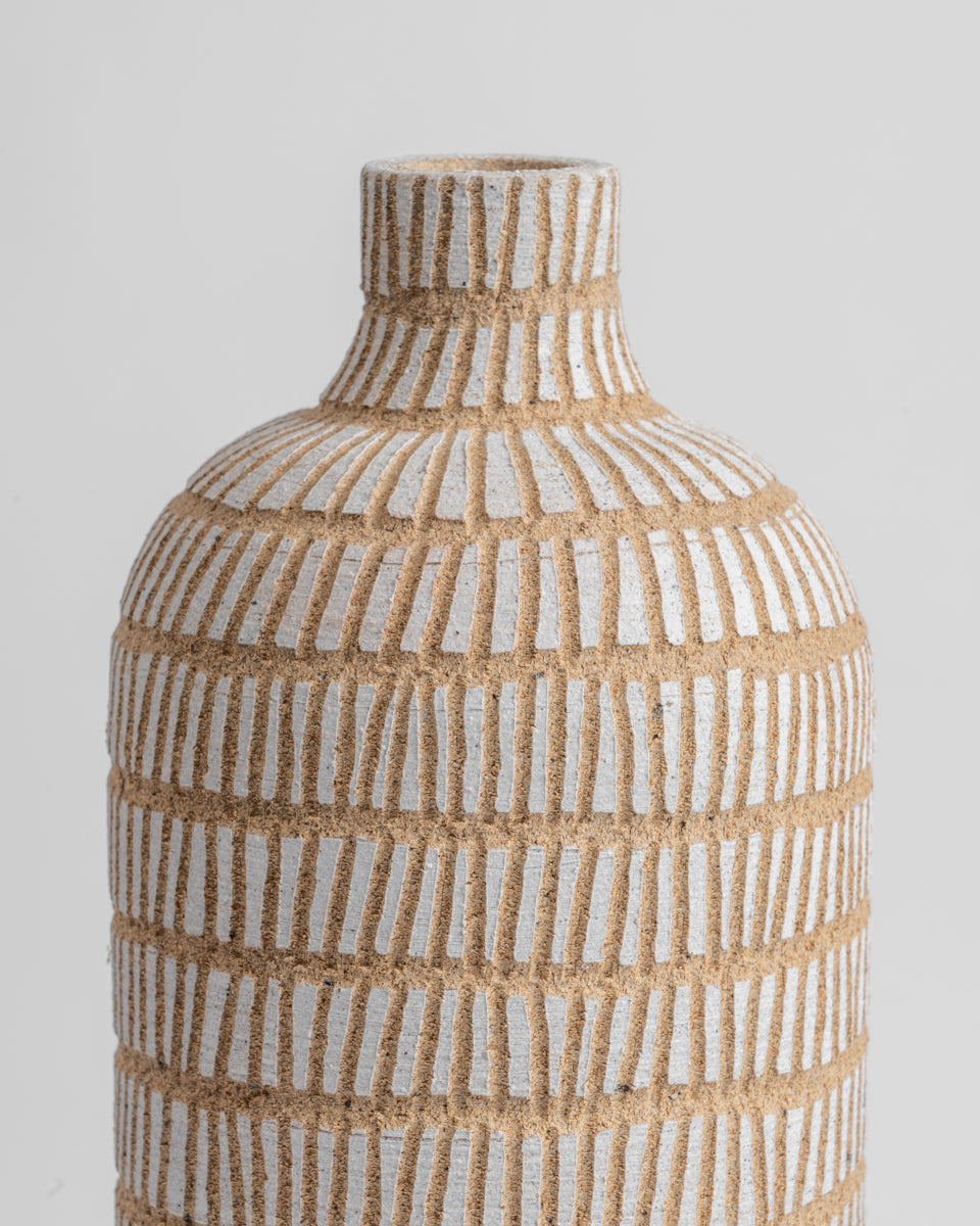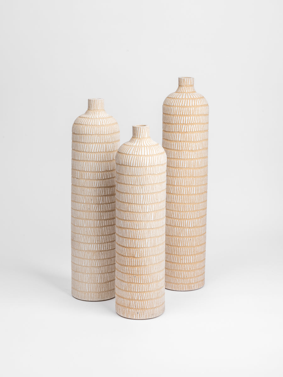 Elevate your decor with the Fawn Tall Bottles, a trio of elegant ceramic vases that exude simplicity and sophistication. With a textured surface and a natural finish, these handcrafted pieces add a timeless aesthetic to any corner of your home. Perfect as standalone decor or styled with dried stems, they bring a touch of understated luxury to your living space.