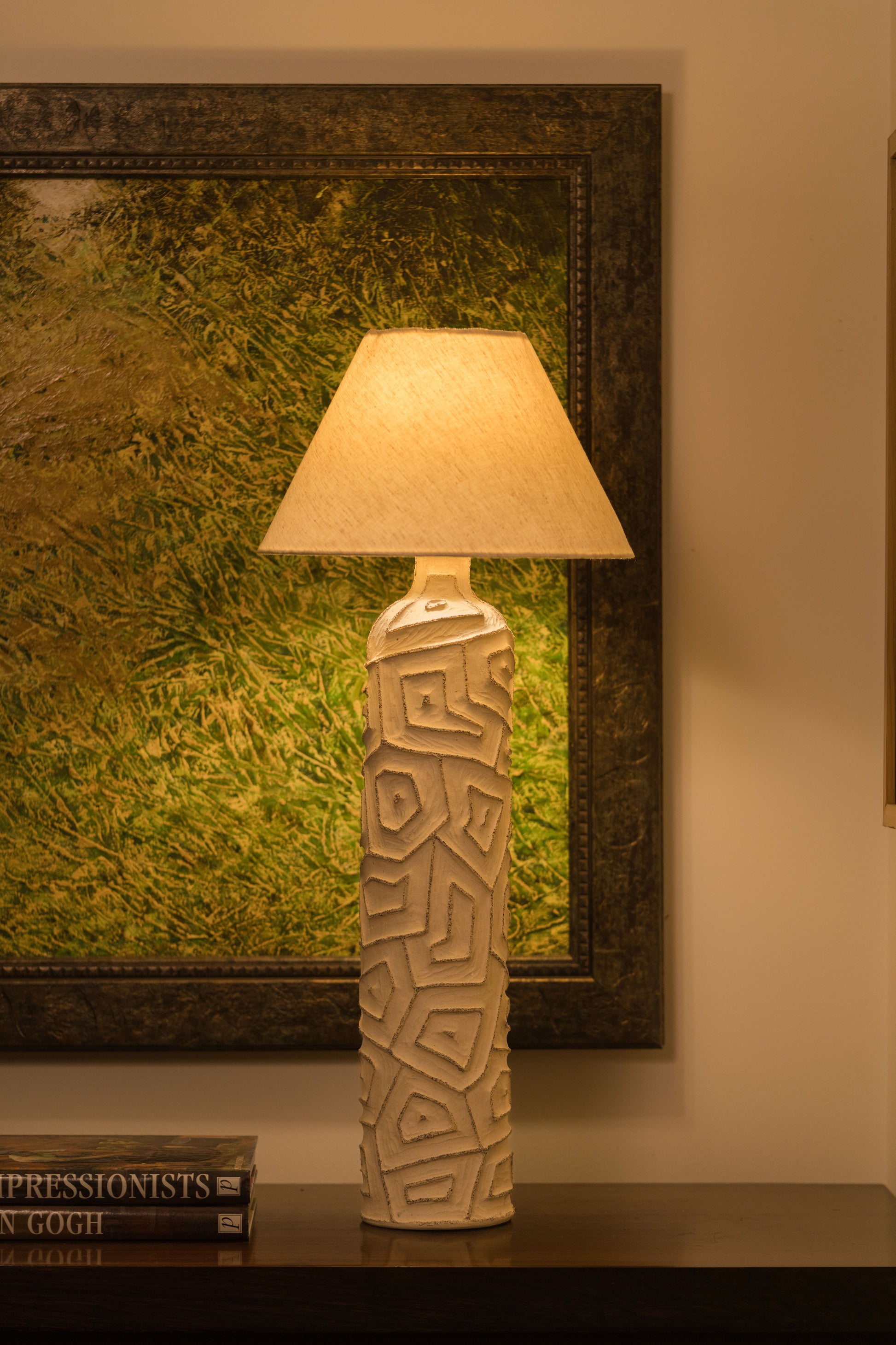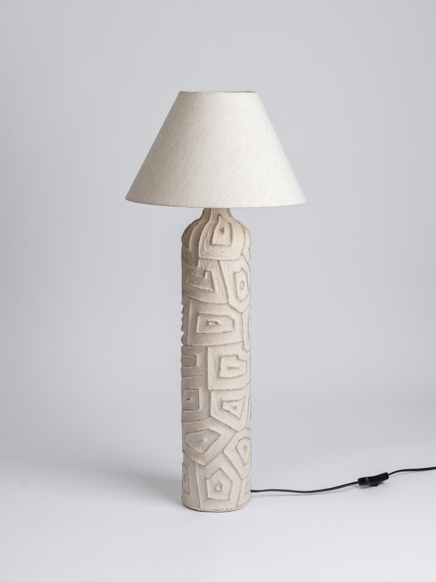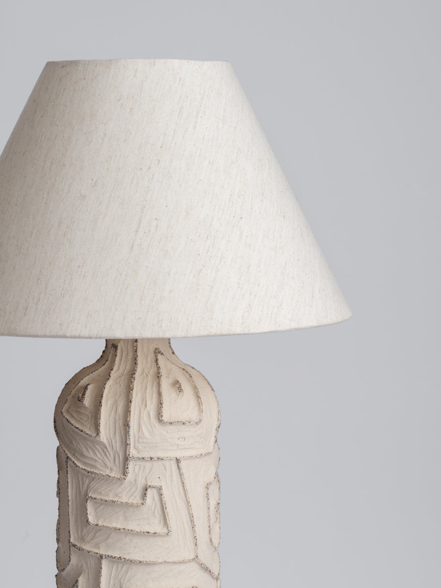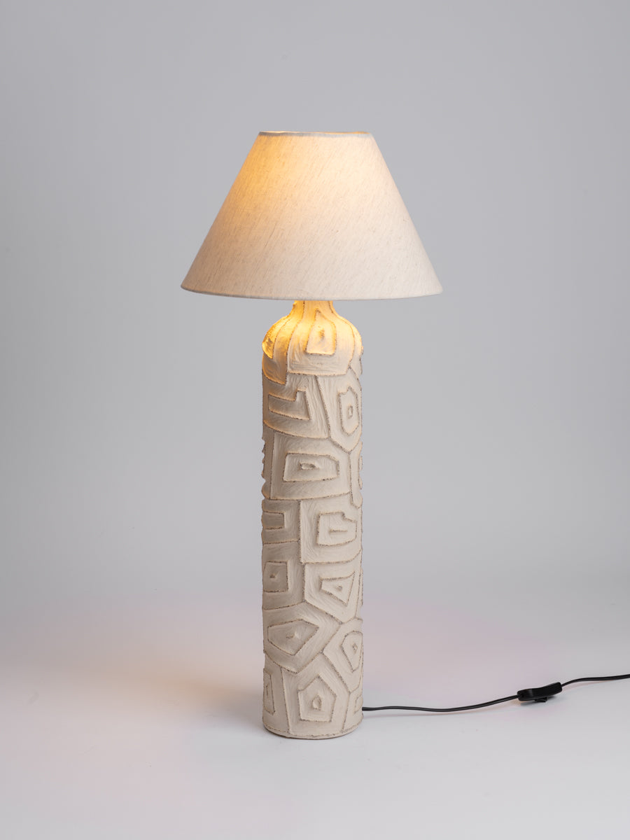Illuminate your space with the Maze Tall Bottle Lamp, a chic and modern addition to any home. Crafted from groggy clay and single-fired to perfection, this cylindrical lamp stands tall, exuding a unique blend of craftsmanship and artistry.