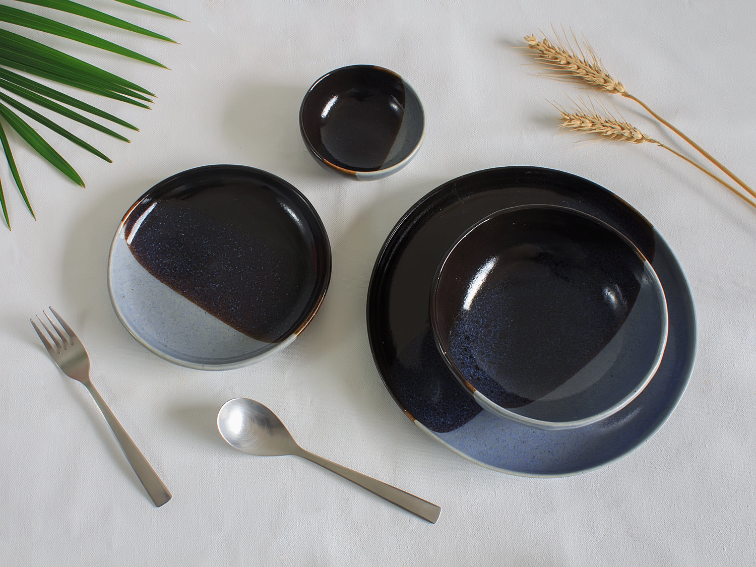 Ceramic Dinnerware set of 6 big plates, 6 small plates, 6 noodle bowls and 6 dessert bowls. It is a durable dinner set finished in a unique double dipped glaze to produce three color tones.