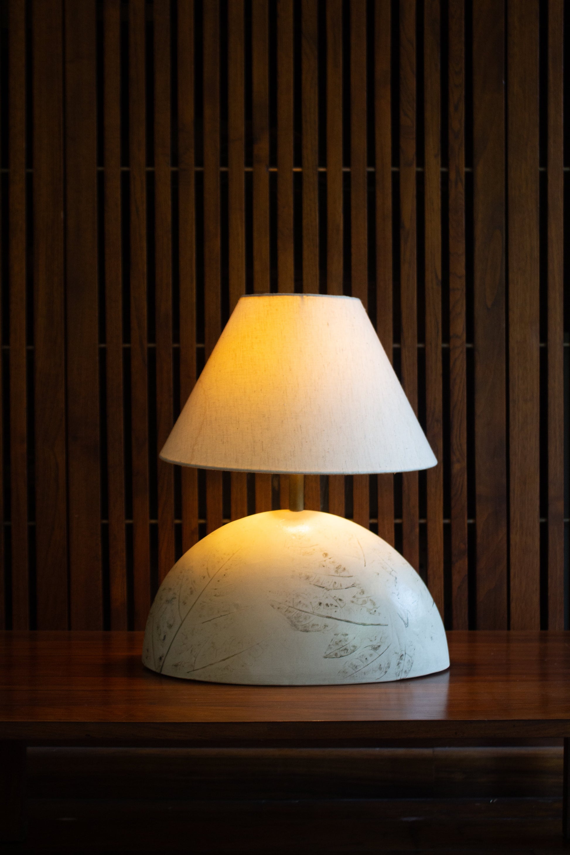 Inspired by nature, the Papaya Leaf Lamp brings an organic touch to your space. The hand-sculpted half-dome ceramic base is delicately imprinted with papaya leaf patterns, giving it a subtle, textured look. Its soft off-white glaze complements the natural motif, creating a soothing ambiance when illuminated. Paired with a neutral lampshade, this lamp is ideal for those seeking a calming, earthy element in their decor.