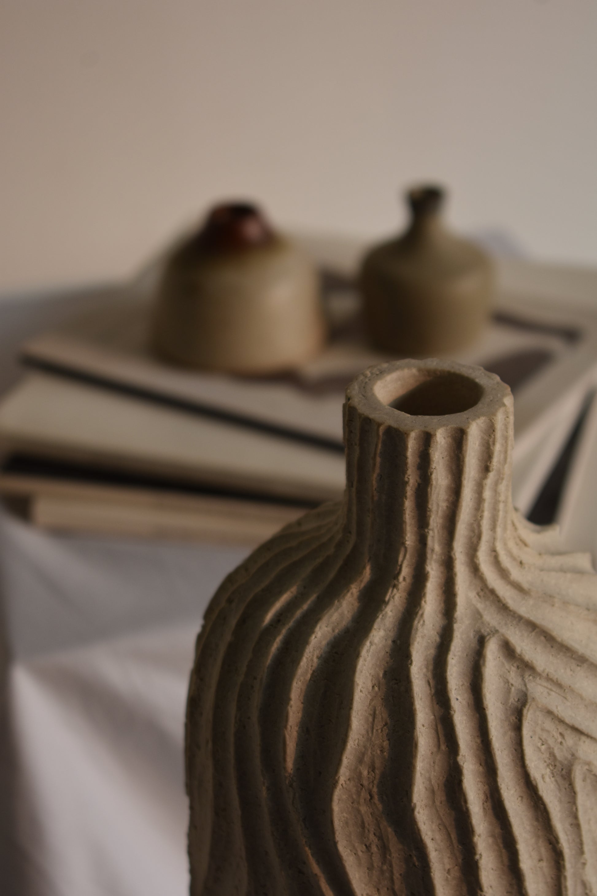 The statement piece in any room, this trio of Sahara bottles elevates your space. Its earthy textures and dynamic presence ensure its essence as a centerpiece in your common living spaces.