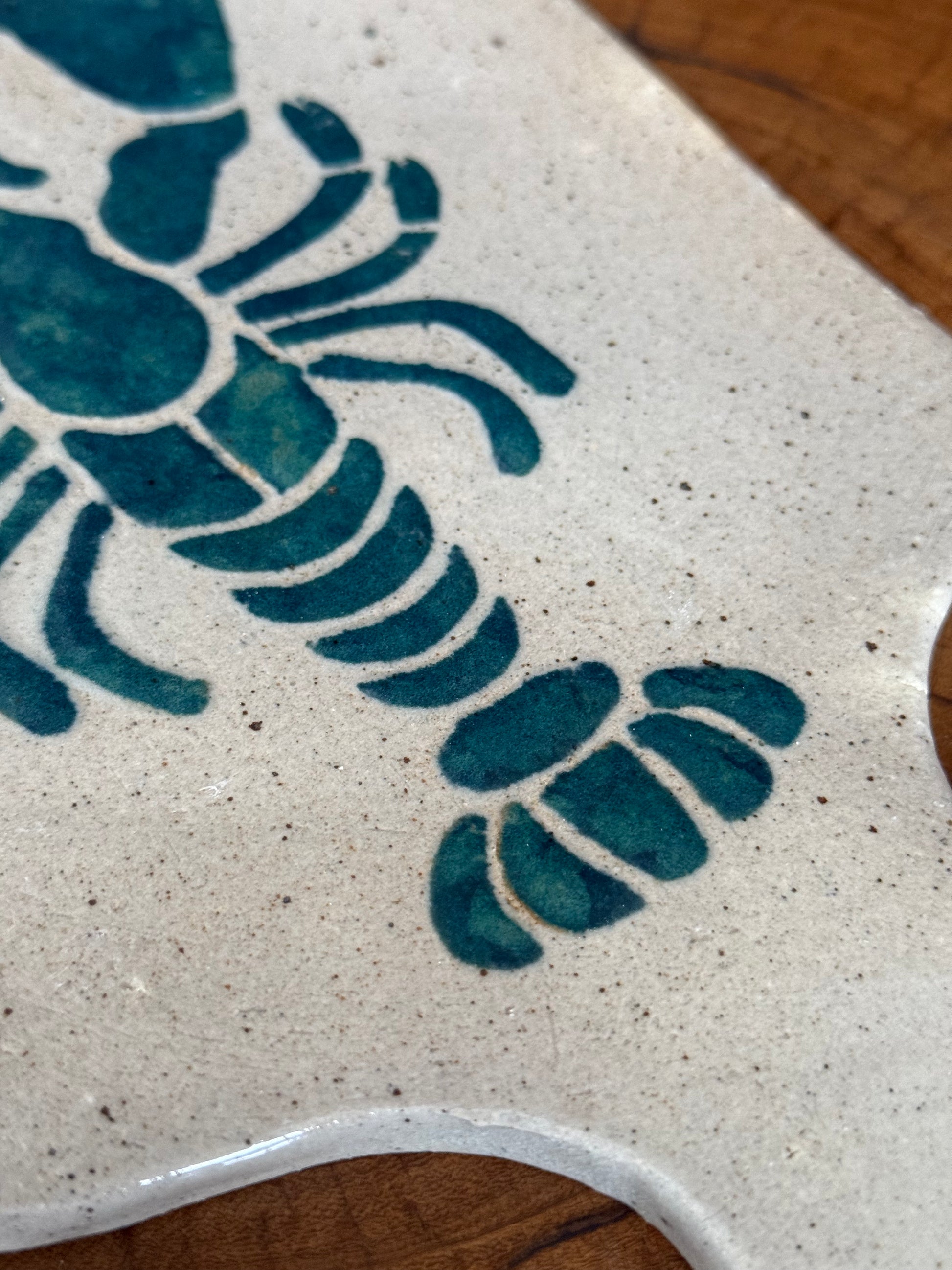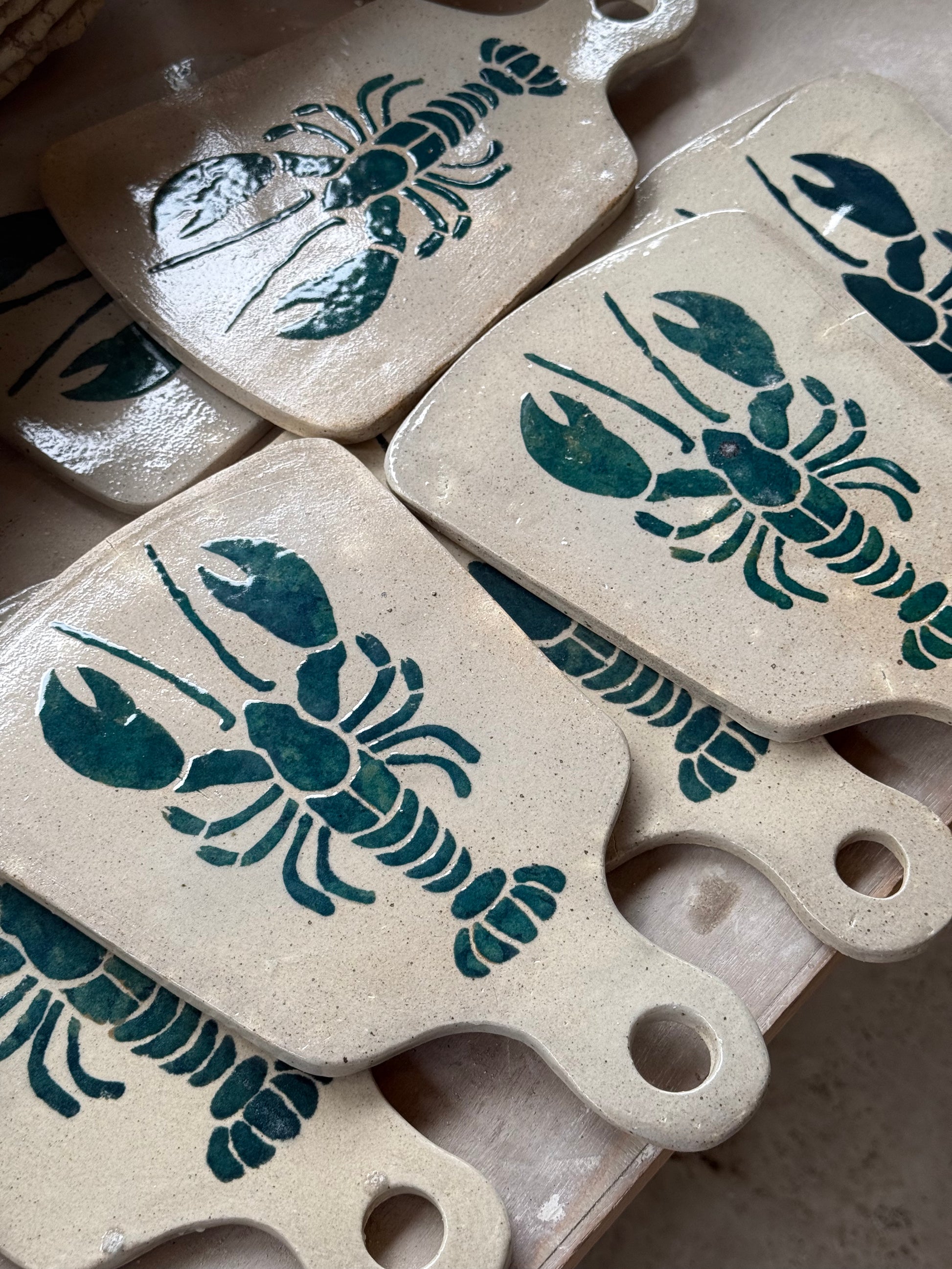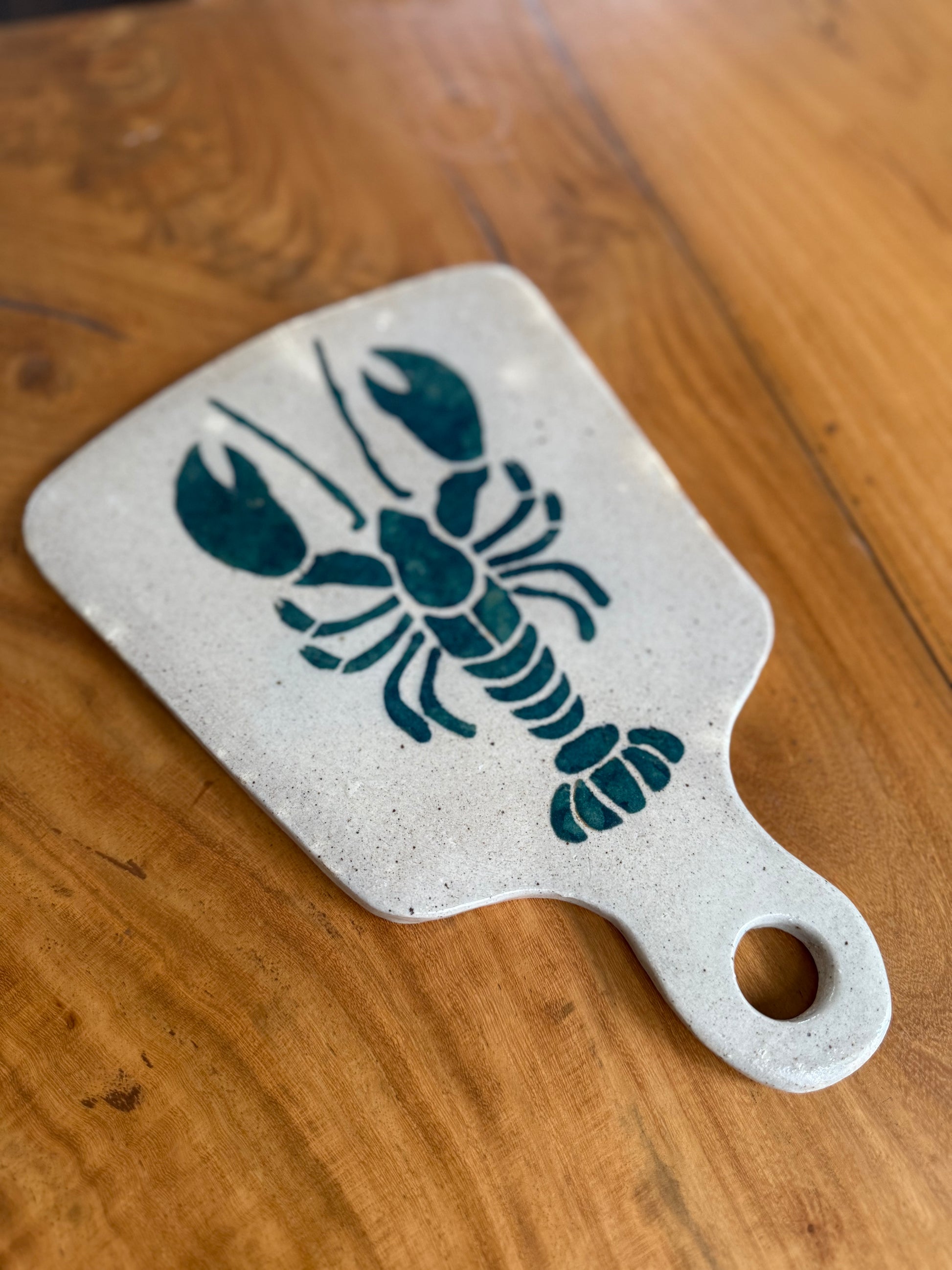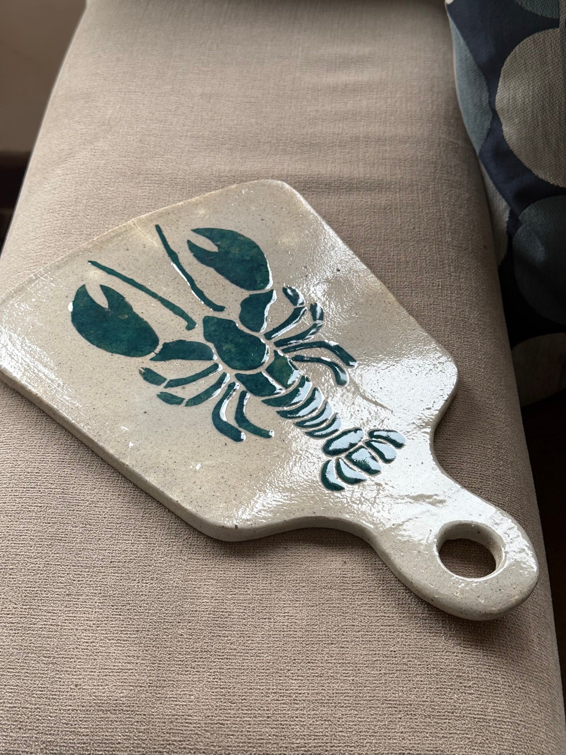 Hand-painted with a striking teal lobster design, this cheeseboard is perfect for serving with a touch of coastal charm. Made in stoneware clay, painted with underglaze stains and coated in clear glaze - this cheeseboard makes for an ideal gift, or addition to your evenings.