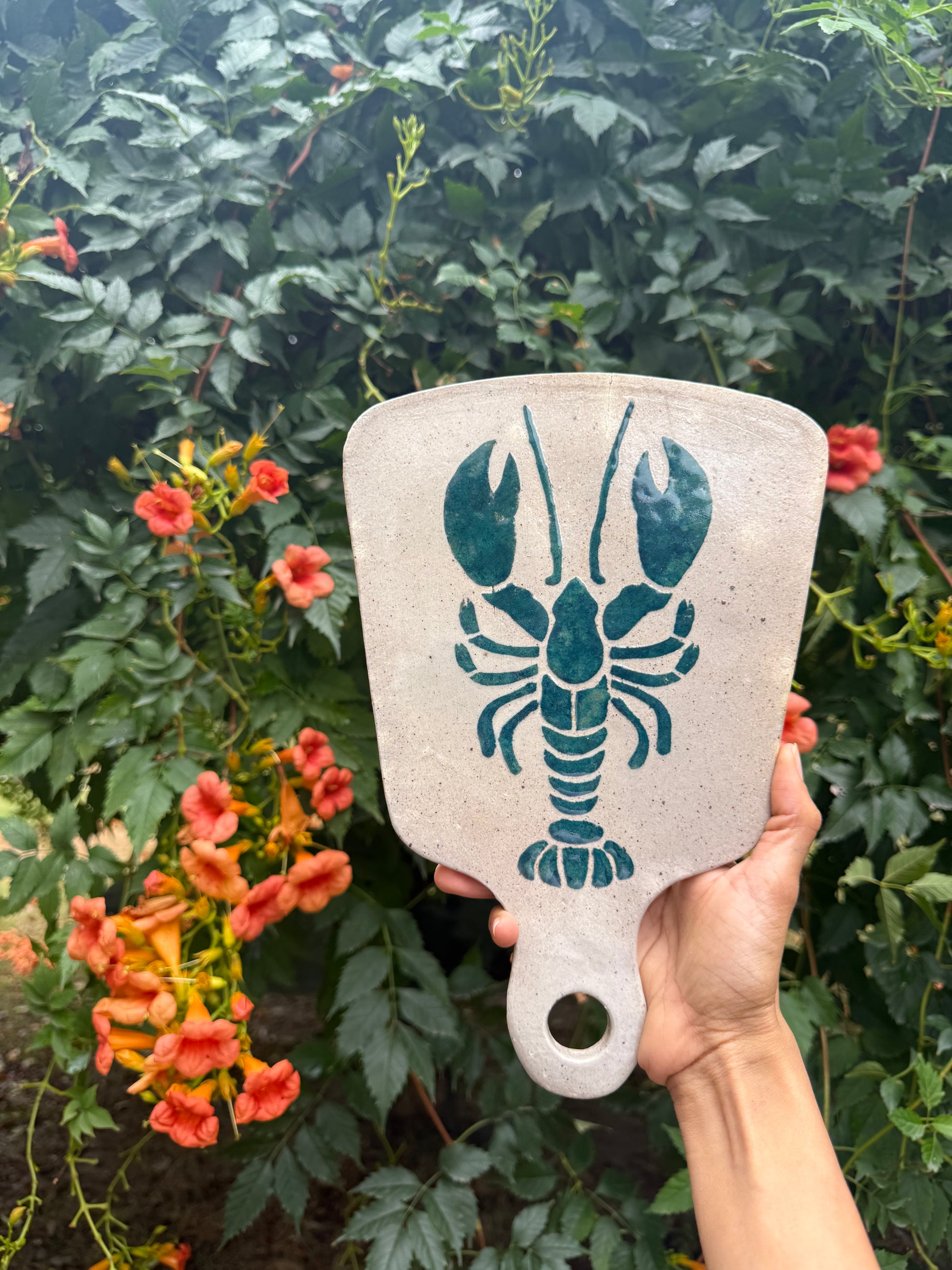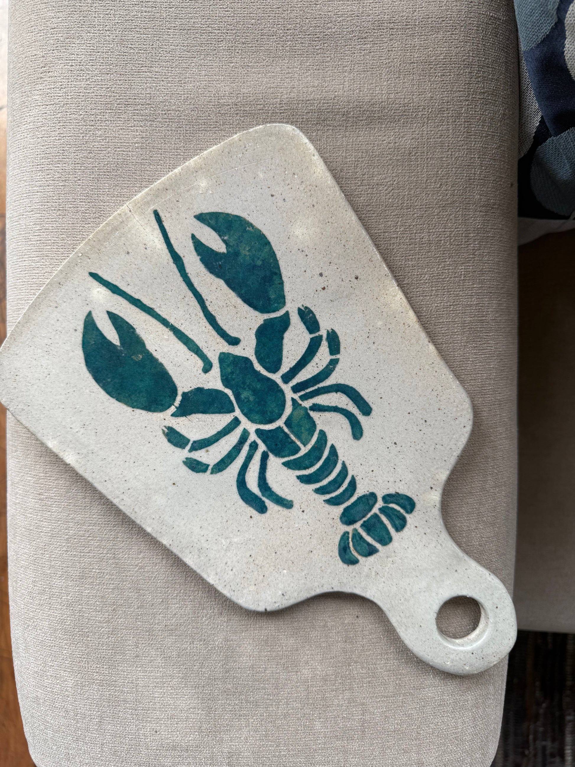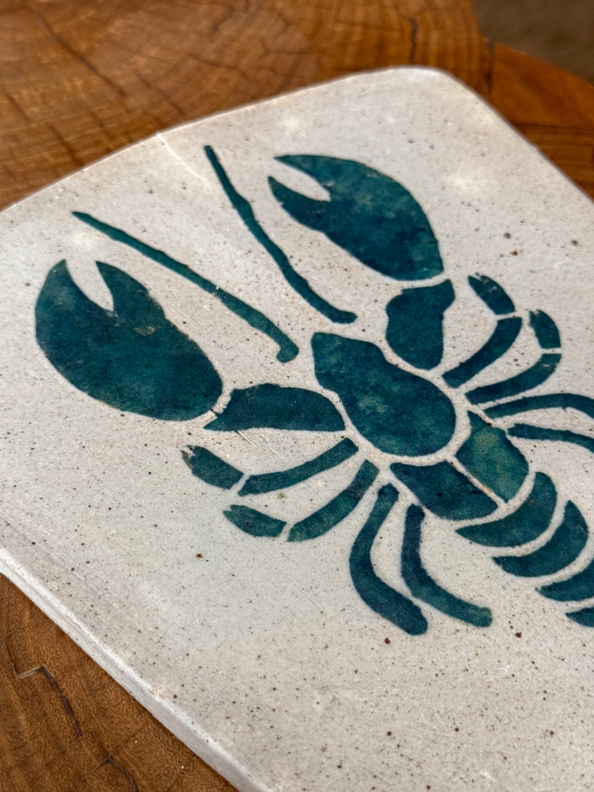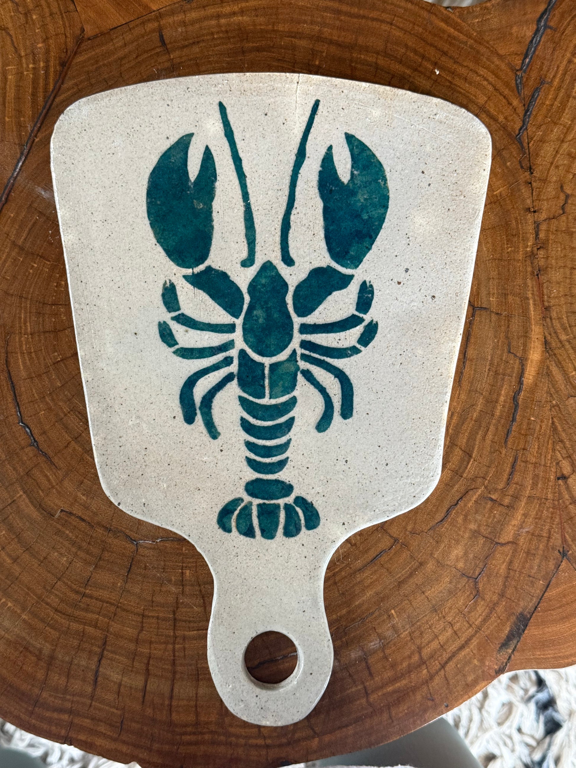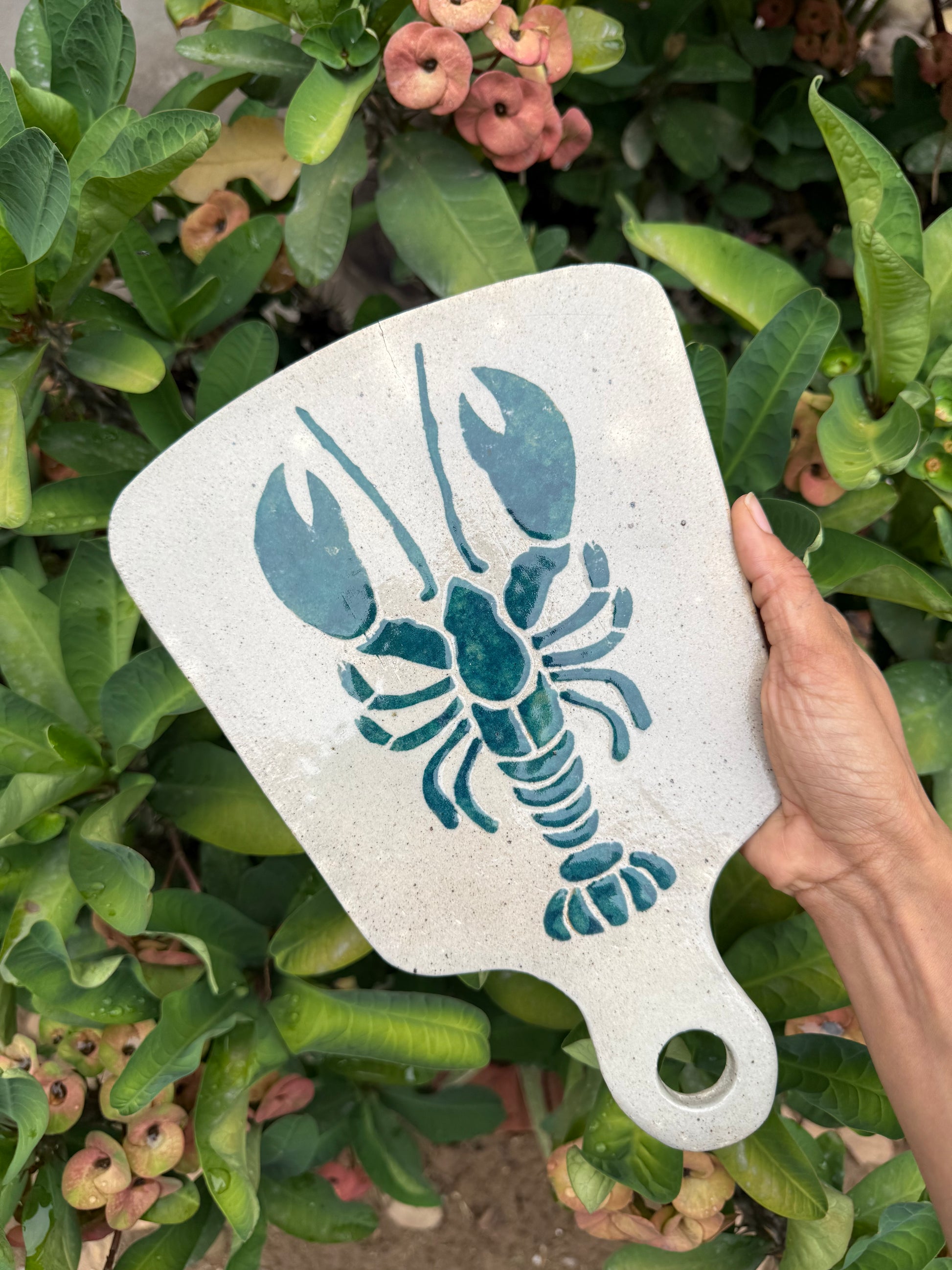 Hand-painted with a striking teal lobster design, this cheeseboard is perfect for serving with a touch of coastal charm. Made in stoneware clay, painted with underglaze stains and coated in clear glaze - this cheeseboard makes for an ideal gift, or addition to your evenings.