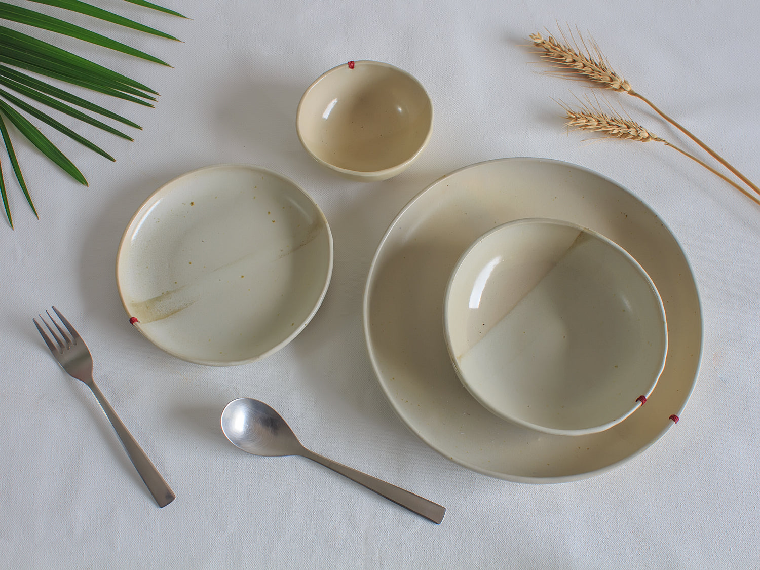 Ceramic Dinnerware set of 6 big plates, 6 small plates, 6 noodle bowls and 6 dessert bowls in a matte cloudy white. It is minimal in design and has a touch of hand threaded red macrame on the edge.